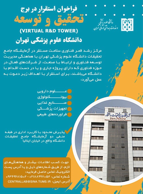به استحضار میرساند مرکز رشد قمر فناوری سلامت مستقر در آزمایشگاه جامع تحقیقات دانشگاه علوم پزشکی تهران با هماهنگی مدیریت توسعه فناوری و ارتباط با صنعت دانشگاه به منظور تسهیل در پیگیری فعالیتهای مرتبط با تحقیق و توسعه صنعتی شرکتها، امکان استقرار صرفاً اداری در طبقه منفی دو ساختمان ازمایشگاه جامع دانشگاه را فراهم نموده است (پوستر پیوست؛ این همکاری به منزله استقرار در برج مجازی تحقیق و توسعه دانشگاه محسوب خواهد شد). خواهشمند است برای کسب اطلاعات بیشتر و هماهنگیهای لازم، از طریق شمارههای ذیل و یا آدرس پست الکترونیک تماس حاصل فرمایید: شماره تماس: ۰۲۱۸۸۹۹۷۰۵۲ – ۰۹۳۶۹۶۸۱۵۰۲ آدرس ایمیل: Centrallab@sina.tums.ir